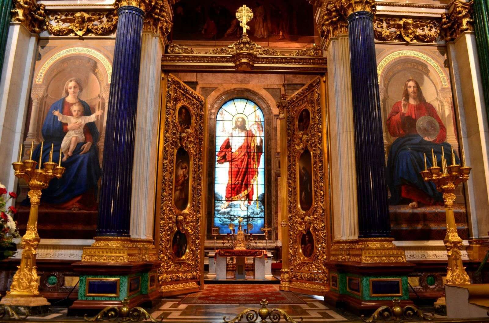 能同時容納1.5萬人的大教堂內部,因采用大量珍稀彩色石料而顯得既莊重又華麗。主祭壇圣像壁65幅圣像以白色意大利大理石作框飾,用烏拉爾孔雀石壁柱分割,僅圣像壁的花銷就占去整個工程費用的10%。地面為棋盤狀深、淺灰色大理石方磚,中央是巨大的玫瑰花環,由玫瑰紅和櫻桃紅大理石拼成。墻體上下分別為白色大理石和黑色板巖,以淺紅色和櫻桃紅色大理石作裝飾裙線。而150幅壁畫和馬賽克鑲嵌畫更從色彩上突出了整個空間的富麗堂皇。其中圓頂壁畫《圣母在圣徒的陪伴下》面積達800平方米,由著名畫家卡爾·布留洛夫(名作《龐培城的末日》的作者)等人創作。