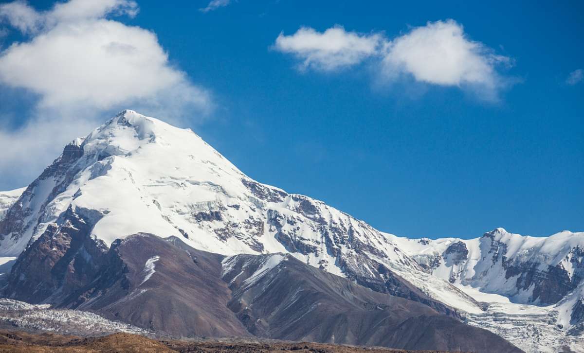 公格爾峰位于新疆克孜勒蘇柯爾克孜自治州阿克陶縣,為昆侖山的高峰之一,海拔7649米。山頂常年積雪,山間懸掛著條條銀光閃閃的冰川,極為壯觀。