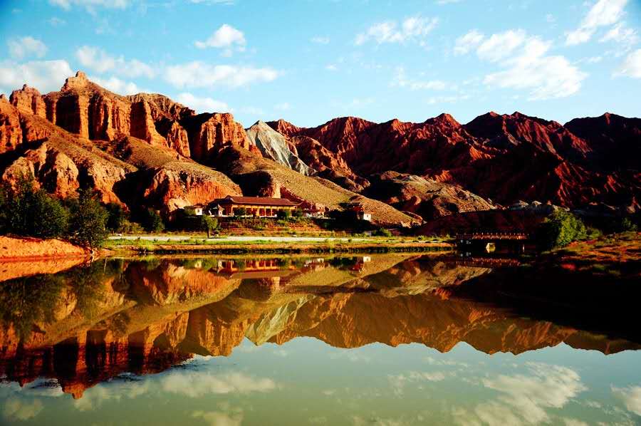 距西寧70公里,交通便利、氣候宜人、景色秀美。 貴德位于黃土高原與青藏高原的過渡地帶,黃河自西向東橫貫縣境中北部,流程76.8公里。在貴德境內(nèi),溝壑縱橫,山川相間,呈現(xiàn)多級河流階地和盆地丘陵地貌。它,恰好處于黃河谷地,南北高,中音像工,群山環(huán)抱,上有龍羊峽鎖關(guān),下在松巴峽守護(hù),四面環(huán)山,平川開闊,土地肥沃,素有高原“小江南”之稱。丹霞地貌在貴德有數(shù)處,最著名的是阿什貢峽。 阿什貢峽自山谷狹長的羊圈灣開始,西至達(dá)卡溝口。峽內(nèi),尕讓河像一條黃色的帶子蜿蜓南下。由于河水的切割,兩岸山巒多為斧劈刀削般的懸崖,加上一些風(fēng)蝕砂巖和較為平緩的山坡,重重疊疊,火紅火紅,綿延數(shù)十里,十分壯觀,至峽口,兩側(cè)山巒成為約50米高的絕壁,筆直的崖面上清晰地呈現(xiàn)出當(dāng)年沉積層的水平線條。那崖頂被雨水沖刷出許我溝壑,有的像塔林,有的像歐式滿面春風(fēng)頂樓房。 峽口,又稱“石門”,兩壁對峙,相距不足百米,兇險異常,而這“一夫當(dāng)關(guān),萬夫莫開”的天險,又好似歷經(jīng)戰(zhàn)火,被“燒”得紅彤彤的。 阿什貢丹霞地貌當(dāng)然不會與戰(zhàn)爭有關(guān),它們是地球內(nèi)外營力的杰作。