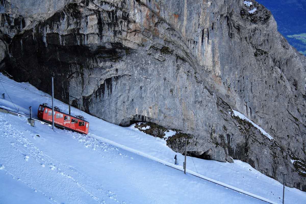 可以乘坐世界上最陡峭的齒軌登山列車(chē)從琉森湖畔的Alpnachstad出發(fā)登頂。