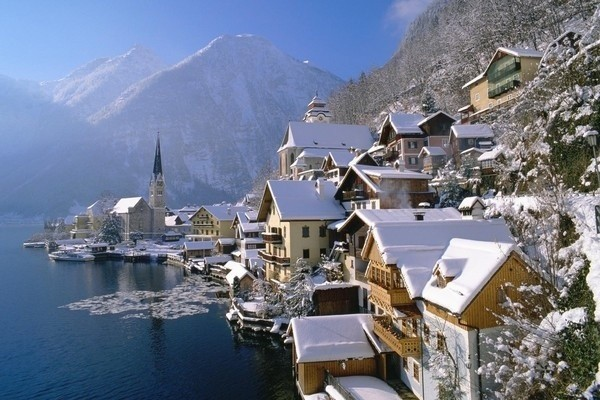 岸邊的許多地方都是峭壁,阿爾卑斯山(一年四季可以滑雪)在湖的北端像是一堵墻。