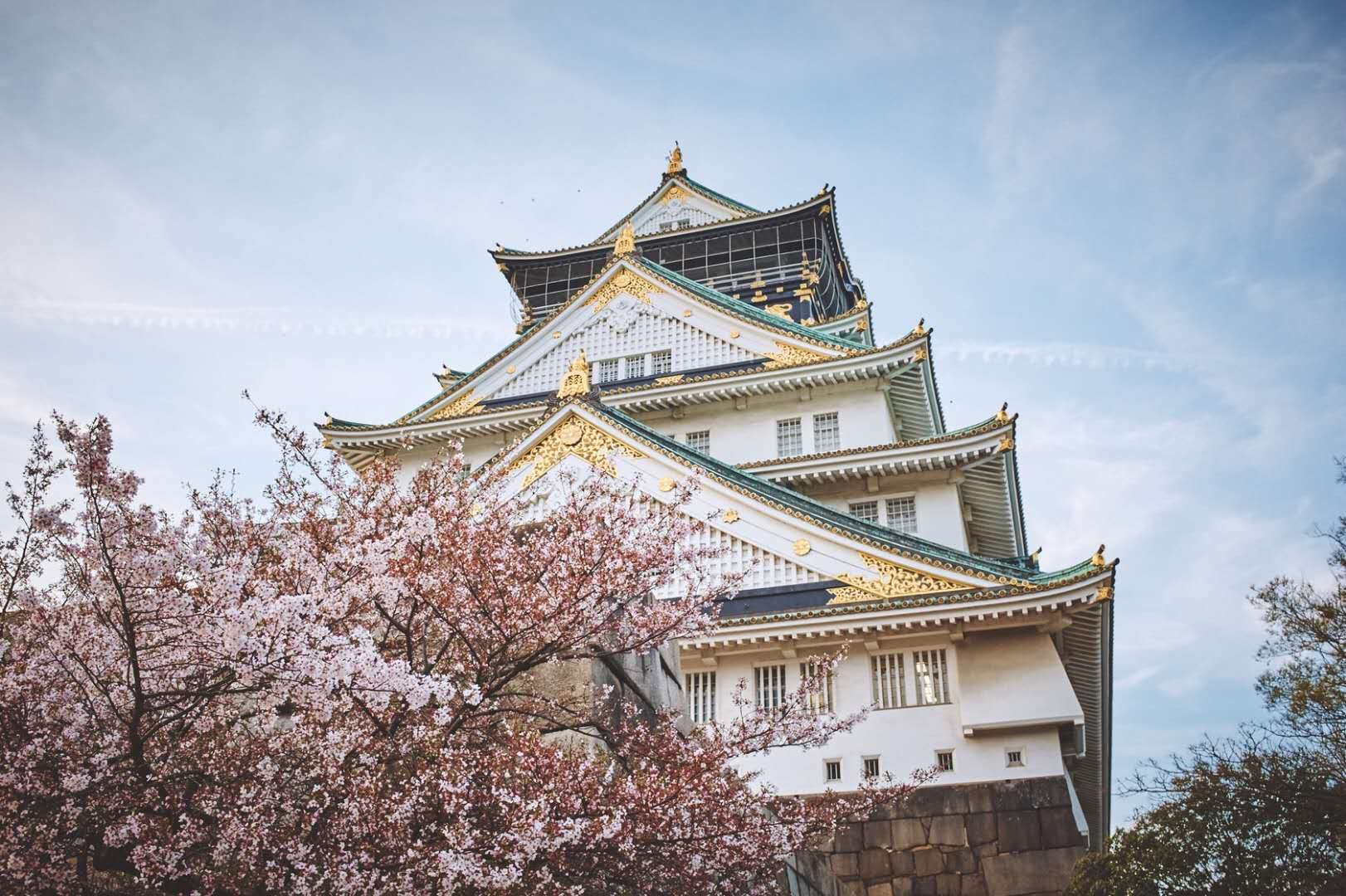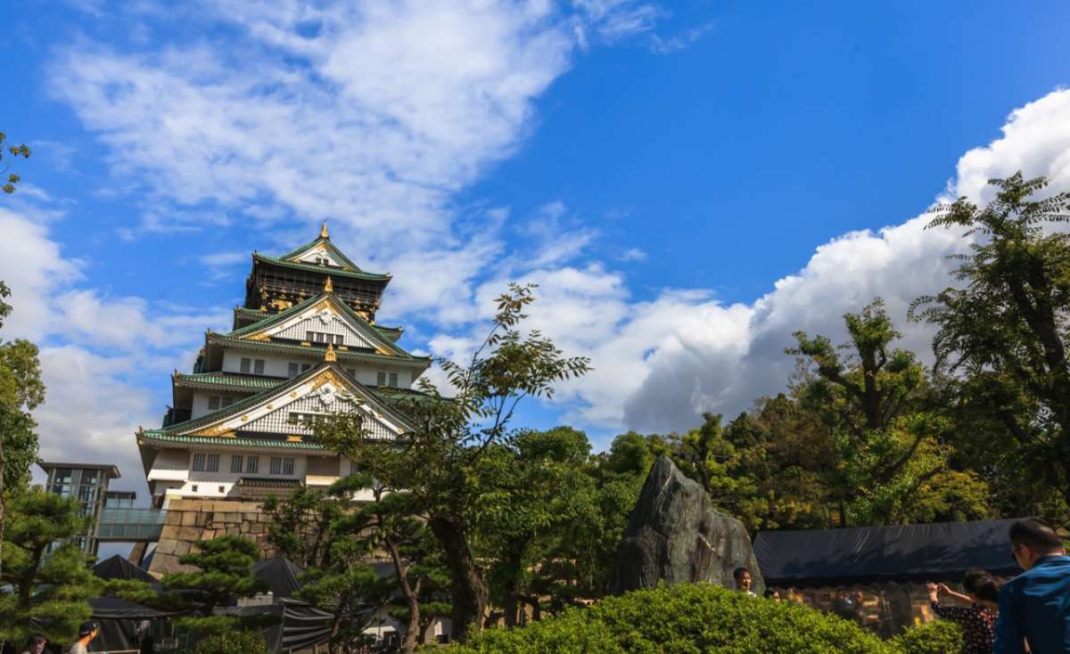 歷史悠久的大阪城,系豐臣秀吉于1586年所建,是由雄偉的石墻砌造而成,大阪城公園內城中央聳立著大阪城的主體建筑天守閣,巍峨宏偉,鑲銅鍍金,十分壯觀。登上高五層八階的天守閣,可以瞭望整個大阪市。如今大阪城已被定為特別史跡。城內的歷史博物館里保存有豐臣秀吉的木像、武器和美術作品等。在西之丸庭園,有一片寬闊的草原和曾遭祝融燒毀并再度重建的外堀、太平門等古跡,是散步休閑的好去處。現存的大阪城公園于1931年由民間集資重建,為后人仿制豐臣秀吉時期的天守閣重制的,大阪城外觀5層,內部8層,高54.8米,7層以下為資料館,8層為瞭望臺,并且有一些紀念品出售。城墻四周建有護城河,附近有風景秀麗的庭園和亭臺樓閣。漫步河邊,奇花異卉,滿目青翠,充滿詩情畫意。城內櫻花門頗為著名,當年大阪城遭遇火災,僅這一道全部用巨石砌成的櫻花門屹立無恙,成為僅存的遺跡。
