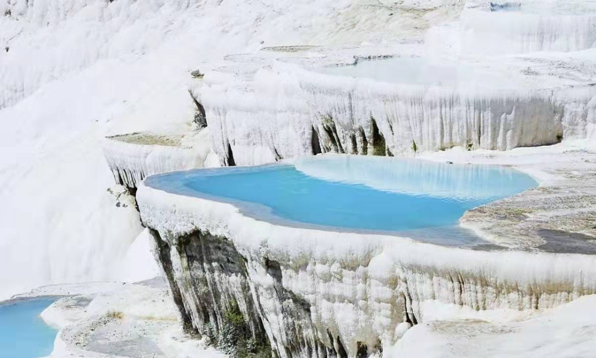 由于在棉花堡上的溫泉是不收費的,所以來此泡溫泉的游人絡繹不絕。進入浴場,一定要赤腳,以防鞋底磨損棉花堡的石灰巖。棉花踩上去并不光滑,走上去甚至有點舉步維艱,但為了保護這片大自然的禮物,多數游人還是把它當成是免費的腳底按摩了。伸腳踏進去,暖暖的泉水讓人有馬上泡進去的沖動。尤其是在炎熱的夏天,溫潤涼爽的泉水更令人感謝這大自然賜予的奇跡。“棉花”正在變黃,棉花堡最早由羅馬人發現,當時的達官貴人與財閥富豪,都以到這里來泡溫泉安享晚年為榮,有些來此治病的人也老死在了這里。對于古代人而言,如此美麗的景色一定是神所生活的地方。因此,修建于天然溫泉附近的重要城市希拉波利斯,一直吸引著來自各地的朝拜者。經過多年的使用,棉花堡的部分石灰巖因為受污染,已變成黃色、灰色,雪白的棉花有點像用過的棉花。而修建在附近的溫泉酒店,也截取了部分水源,導致棉花堡水量巨減。缺水、變質,成了棉花堡的最大問題。