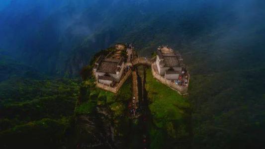 紅云金頂:山峰拔地而起,垂直高差達百米。上半部分一分為二,由天橋鏈接,兩邊各建一廟,一邊供奉釋迦佛,一邊供奉彌勒佛。由此印證現代佛(釋迦牟尼)向未來佛(彌勒佛)的交替。晨間紅云瑞氣常饒四周,人稱紅云金頂。