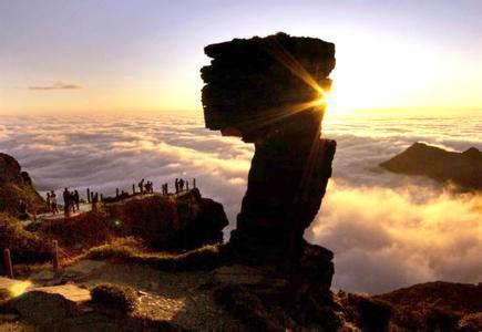 老鷹巖:梵凈山頂一塊似鷹嘴的巖石,這是一方聳立在山巔的巨石,其形狀像一只神情嚴視,展翅欲飛的天鷹,屹立于山巔。