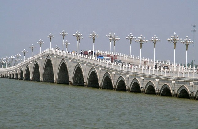 東昌大橋位于聊城古城西首,橫跨東昌湖東西兩岸。2001年6月動工修建,2003年落成。古時,人們是由吊橋進入古城區,現在連接古城和新城的紐帶就是橫跨在東昌湖上的四座關橋了。東昌大橋是在原西吊橋的原址部位上修建起來的,它是我市城區投資最多,規模最大的橋梁。東昌大橋全長322米,橋面凈寬15米。上部結構為石砌拱橋,共21孔,象征著跨入21世紀,所以又稱世紀拱橋。版權所有山東聊城聊之旅國際旅行社有限公司,轉載必究!中間5孔為懸鏈線拱,兩側為圓弧拱。主孔通航凈高9米,可供大型游船順利通過。拱圈、橋身采用花崗巖嵌面,橋面青石鋪砌,橋上筑有優質漢白玉攔板266塊,漢白玉欄桿上雕刻著《水滸》人物故事圖案,漫步東昌大橋一個來回,就如同看了一遍《水滸傳》。被譽為“中國江北最大內陸湖泊石拱橋”,堪稱橋梁精品,為美麗的東昌湖增添了一道亮麗的景色。