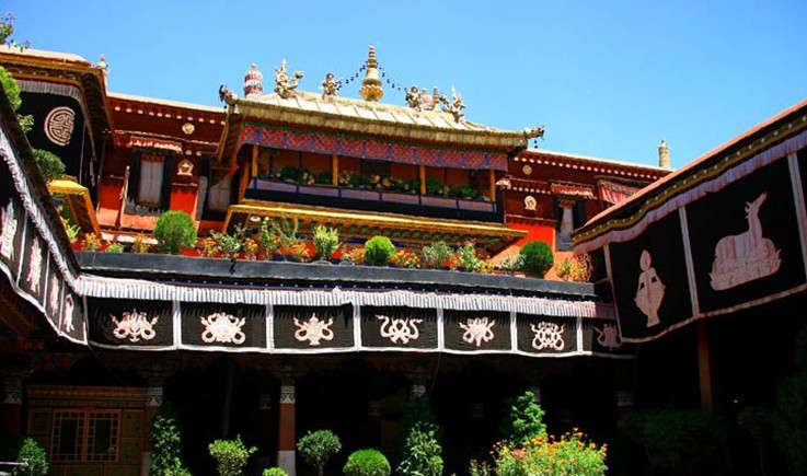 雍布拉康坐落在澤當鎮東南約5公里的扎西次日山上,是西藏最早的宮殿。雍布拉康已有2100多年的歷史,3曾建筑。一層的前半部為門廳,面積33平方米,門廳處是一個帶檐的小平臺。后半部是佛殿,供奉松贊干布、文成公主等塑像。第二層亦分前后兩部分,前半部分為三面環繞矮墻的平臺,后半部是帶天井的回廊。五世達賴喇嘛時在碉樓的頂部加蓋了四角攢尖式金頂。雍布拉康除部分僧房外,還有一間曾供歷代達賴喇嘛來此禮佛時居住的臥室。