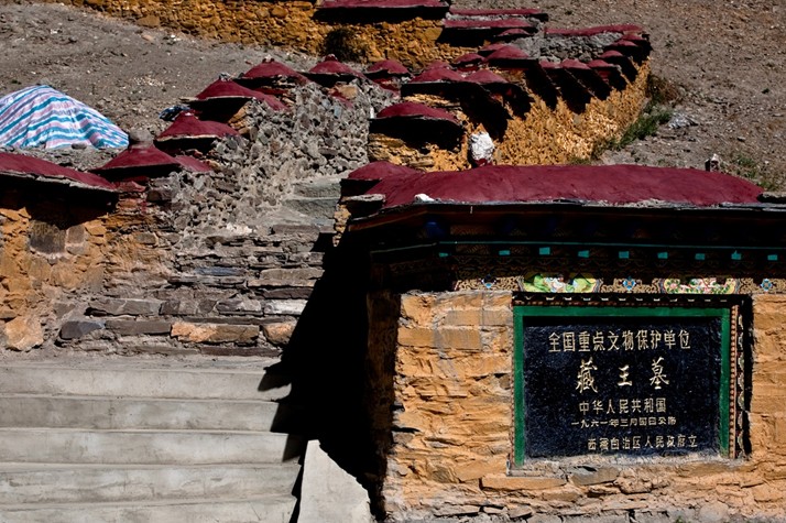 藏王墓屬全國(guó)重點(diǎn)文物保護(hù)單位,位于山南窮結(jié)縣宗山的西南方,背靠丕惹山(意為增長(zhǎng)之山),是吐蕃王朝時(shí)期第29代贊普至第40代(末代)贊普、大臣及王妃的墓葬群,總面積385平方米。各陵墓封土高大,為土壘成的高臺(tái)丘墓。其上層土墩為橢圓形,墩頂極平坦,東西長(zhǎng)約130米;下層為長(zhǎng)方形土臺(tái),周邊不齊整。藏王墓的數(shù)目現(xiàn)難確定,能看到的有八九座。靠近河邊的大墓據(jù)說是松贊干布之墓,與之相鄰的是赤松德贊的墓,墓旁有巨大功德碑。在9世紀(jì)中后發(fā)生的奴隸起義中,贊普陵墓全被搗毀,現(xiàn)在的藏王墓只是衣冠冢而已。