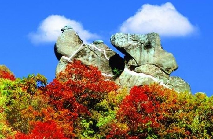 在白樺林附近,游路邊的山峰頂部,兩塊巨石狀如鴛鴦相依相偎。關(guān)于鴛鴦石,在當(dāng)?shù)剡€流傳著動(dòng)人五岳寨-鴛鴦石的神話傳說。