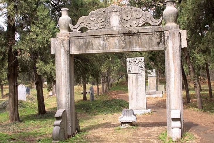 孔子墓前東側(cè)有三亭,是宋真宗、清圣祖和清高宗來此祭孔時(shí)停留之處,叫作“駐蹕亭”。 墓南二百米處的亭殿后,有子貢親手栽植的楷樹遺跡和“子貢廬墓處”。 孔林中除孔子墓外,氣派較大、墓飾規(guī)格也高的,要數(shù)第七十二代孫孔憲培妻子的墓——于氏坊。這位于氏夫人原來是乾隆皇帝的女兒,因當(dāng)時(shí)滿漢不通婚,皇帝便將女兒過繼給一品大臣于敏中,又以子女名義下嫁給衍圣公,故稱于氏坊。