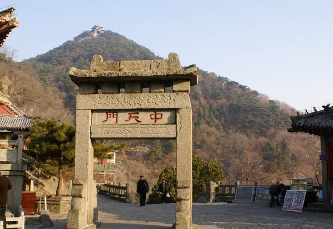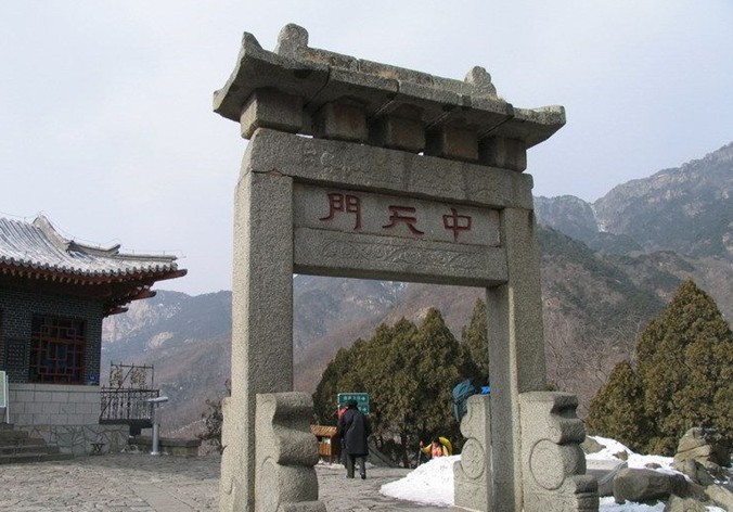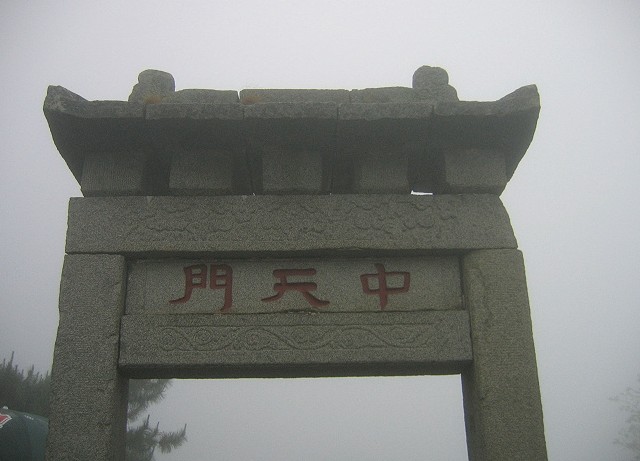 中天門建于清,為兩柱單門式石坊。泰山古時多虎,古人在坊北建廟祀黑虎神,現(xiàn)廟內(nèi)塑財神趙公元帥執(zhí)鞭跨虎,東為仿古茶樓,西南為中溪賓館,西北為中天門索道站。