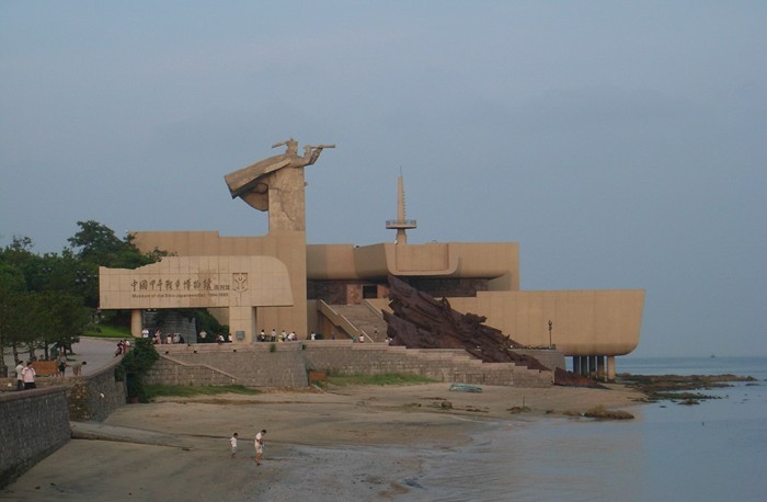 甲午海戰紀念館坐落于甲午戰爭紀念地威海劉公島上,是一處以建筑、雕塑、繪畫等綜合藝術展示甲午悲壯歷史的大型紀念館。館內以電、光、聲等現代科技營造的氛圍,生動逼真,游人置身其中,耳聞目矚甲午戰爭的慘烈與悲壯。整個海戰館氣勢宏大,外型有如幾艘互相撞擊穿插的船體,坐落在當年旗艦定遠號擱淺的地方,懸浮于海上。18米高的主體建筑上塑造了一尊15米高的北洋海軍將領像,為國內人物雕塑之最。