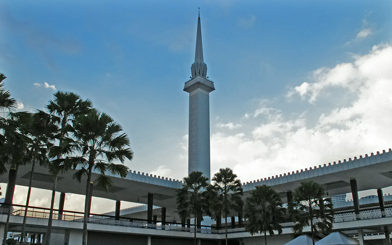 伊斯蘭教是馬來西亞的國教,清真寺遍布全國,吉隆坡市中心的國家清真寺,占地5.5公頃,于1965年建成,這是一組包括祈禱大廳、大尖塔、陵墓和辦公大樓的建筑群,其造型和裝飾與麥加的三大清真寺相仿,氣勢恢弘,是伊斯蘭建筑藝術的杰出代表