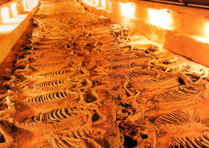 據專家考證,殉馬多數是 6--7 歲口的壯年馬,是人為處死后,按照一定的葬式排列而成,馬分兩行,排列整齊,昂首側臥,四足蜷曲,呈臨戰姿態,好像只要聽到戰鼓擂動還會四蹄騰空。