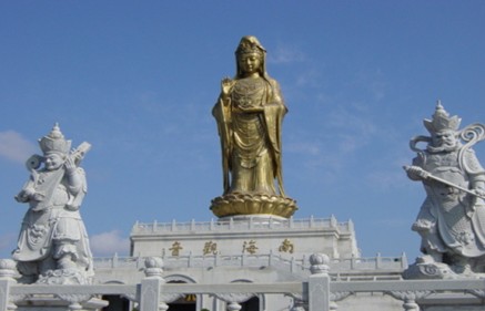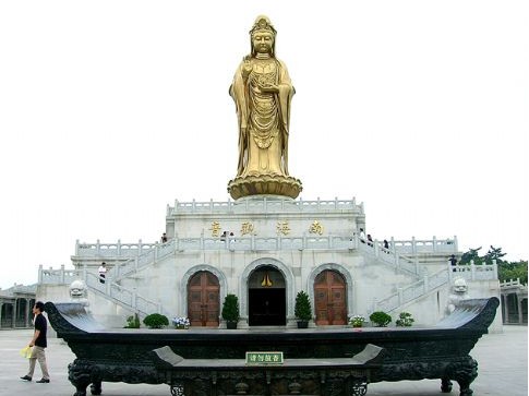 南海觀音露天銅像位于普陀山之東南的龍灣崗巔。菩薩臉如滿月,眉目清秀,左手托法輪,右手結無畏印,顯現大慈大悲相,光耀天日,壯麗無比。像高33米,重70余噸,乃當今觀音銅像之最,也是海天佛國的象征。版權所有聊城聊之旅旅行社有限公司,轉載必究!佛像基層是面積1000多平方的功德廳,上層供奉500尊形態各異的觀音銅像,下層大廳飾有觀音靈異故事的大型黃楊木雕和以普陀山景色為題材的彩玉浮雕,精美絕侖。