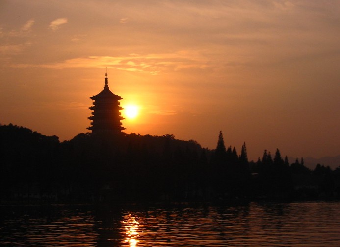 夕照雷峰霞滿天,天光云影碧水漣, 漣漪拍岸輕舟過,古塔輝煌萬人瞻。