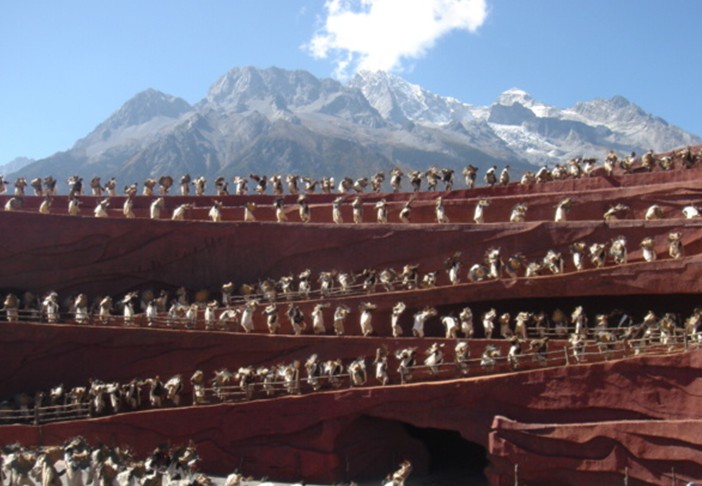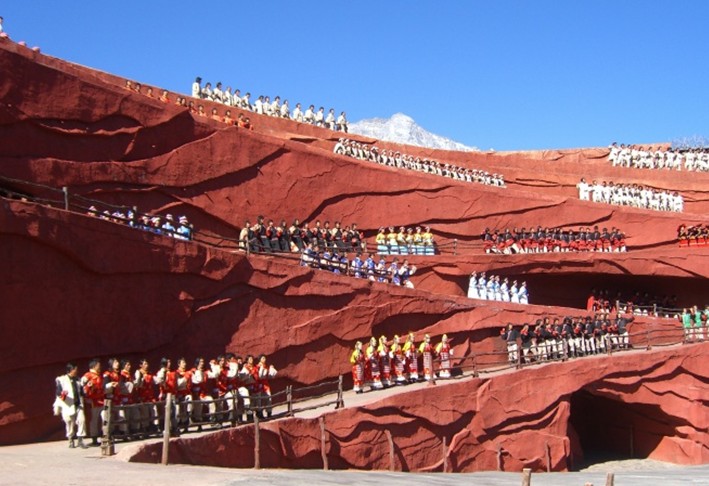 2008年7月23日,版權所有山東聊城聊之旅國際旅行社有限公司,轉載必究!大型實景演出《印象•麗江》雪山篇終于在海拔3100米,世界上海拔最高的實景演出劇場—云南麗江玉龍雪山的甘海子藍月谷劇場正式公演。當日,實景演出的總導演張藝謀、王潮歌、樊躍及導演組全體成員,云南省、麗江市的領導及全球100多家媒體齊聚這里,共同見證《印象•麗江》雪山篇的正式公演的壯麗景象。
