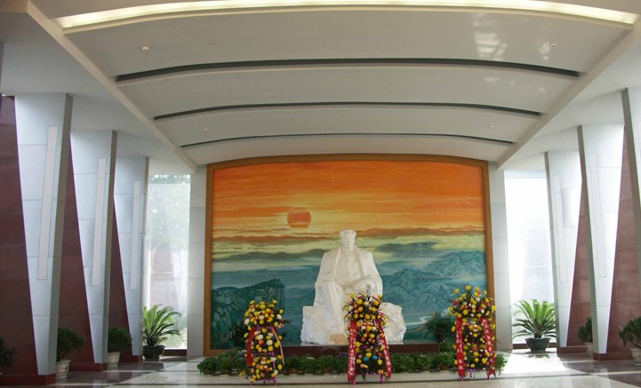 進門是一寬敞大廳,廳前,一尊高2.67米、重達3噸多的毛澤東塑像立于紅帳之前,毛澤東身著風衣,左手捏軍帽,右手前揮。 沿著一條開滿鮮花的走廊,走近序廳,廳內依次陳列了全國六大革命紀念地的圖片,即韶山、毛澤東故居、上海一大會址、黃洋界、遵義會議舊址,延安、天安門,向人們展示了中國革命的歷史進程。 序廳中央,展示了一座韶山山水模型,將韶山210平方公里濃縮于此中,出序廳,上臺階,過假山,沿回廊來到會客室,會客廳靠墻豎立著一尊巨型毛澤東銅像。版權所有山東聊城聊之旅國際旅行社有限公司,轉載必究!再往東通往樓上,三個院落呈品字形排列,在中庭的對角,各有2個小院,南院是一處臺地,與下棟參差錯落,這兒光線較暗,為紀念館內兩處藏寶之地:毛澤東遺物展和中南海故居。