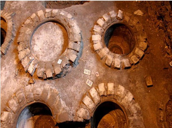 遺址位于李渡鎮紅石橋李渡酒廠老廠區內,元代至近現代燒酒作坊遺址。遺址考古勘探面積1600平方米,2002年考古發掘面積300平方米。揭露的文化堆積主要為元、明、清遺跡與遺物。其文化堆積的11個層面分為南宋、元、明、清、近代、現代6個時期,未見南宋遺跡,其余5個時期的釀酒遺跡有水井、爐灶、晾堂、酒窖、蒸餾設施、墻基、水溝、路面、灰坑、磚柱等。水井位于遺跡中心部位,始建于元代,后經增高,深4.25米,六邊形紅麻石井圈,口徑0.66-0.72米,井臺三合土筑。爐灶始建于明代,紅石與青磚砌,長徑2.80米,短徑1.42米,殘高1.98米,煙道位于頭端兩側;灶前操作坑呈“凹”字形,長2.70米,寬1.60米,深1?84米。晾堂2處,明代晾堂50平方米,清代晾堂40平方米,卵石與三合土筑,表面不平,邊界用紅石砌。酒窖22個,其中元代酒窖13個,直徑約0.65-0.95米,深約0.56-0.72米;明代酒窖9個,有6個至今仍在使用,直徑0.9-1.1米,深約1.52米。