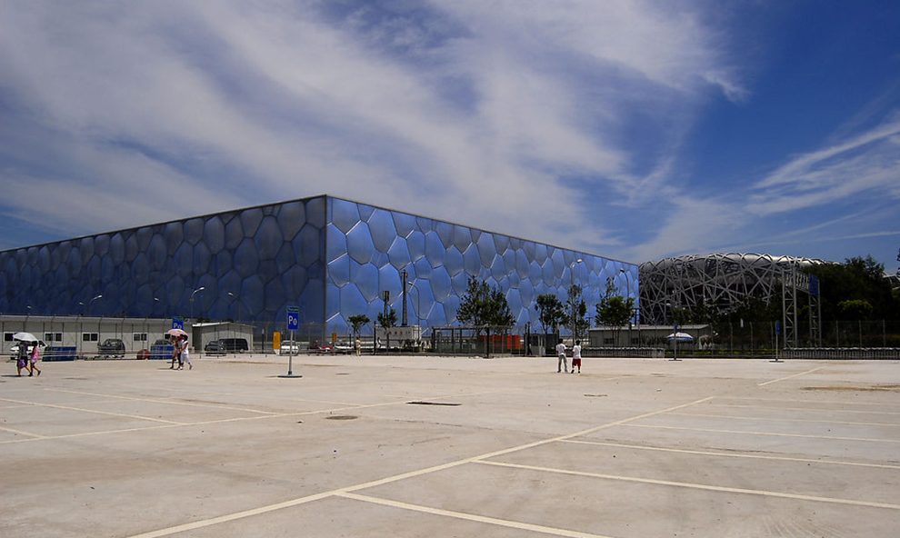 “水立方”與“鳥巢”只有一路之隔,一方一圓,一藍(lán)一紅,形成了一種微妙、均衡的關(guān)系。中方主設(shè)計(jì)師趙小鈞先生介紹說(shuō),就設(shè)計(jì)過(guò)程來(lái)說(shuō),是先有‘鳥巢’,所以,一開(kāi)始做這個(gè)設(shè)計(jì),關(guān)于如何跟‘鳥巢’形成一個(gè)和諧的、統(tǒng)一的、對(duì)比的、互相映襯這樣一個(gè)關(guān)系,就是大家重點(diǎn)討論的一個(gè)方面。