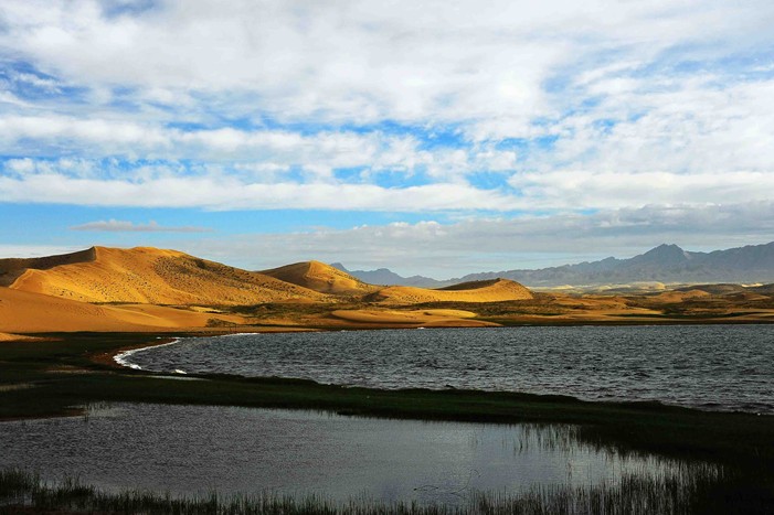這就是金子海,蒙古語意為阿東木拉古湖,面積約0.45平方公里。相傳成吉思汗領(lǐng)兵經(jīng)過此地時,丟下的金盞化為金子海;版權(quán)所有山東聊城聊之旅國際旅行社有限公司,轉(zhuǎn)載必究!也有傳說牦牛山上下來一對金羊,在湖邊飲水,嘗到水味香醇甘甜,就不愿再回山而進(jìn)入湖中,故稱該湖為金子海。海的西側(cè)、西北側(cè)、東側(cè)都被沙山環(huán)抱,沙質(zhì)是那般細(xì)膩,情不自禁讓人赤足,與其有更為親密的接觸。唯獨海的東南側(cè)是高高的蘆葦和近百米的草帶,吸引著鳥禽、牛羊覓食、嬉戲、休憩。水至清則無魚。由于金子海是由一眼甘甜的泉水日積月累而成,因此水極為清澈,淺水處不曾發(fā)現(xiàn)魚兒,版權(quán)所有山東聊城聊之旅國際旅行社有限公司,轉(zhuǎn)載必究!有的只是小海螺和小貝殼。其實,海的深處是有魚的。考古發(fā)現(xiàn)金子海的東邊是青銅器時代的文化堆積層,有石器和諾木洪文化夾砂褐陶罐殘片;說明,海的形成歷史悠久。在茫茫戈壁,有這樣一池甘甜的泉水養(yǎng)育著周圍的牧民,滋潤著這片土地上的一切生物,生生不息。