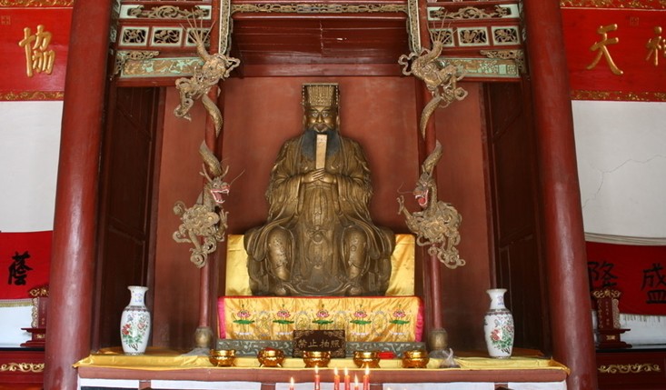 大成殿殿頂用黃、綠、藍、三色琉璃瓦覆蓋,門窗、木柱用朱漆彩畫,整座建筑雕梁畫棟,金碧輝煌。大成殿的門上方掛著歷代皇帝、名人題的“萬世師表”、“與天地參”、“圣集大成”、“斯民在茲”等九塊匾額,紅底金字,光彩奪目。在大成殿內正中的1.6米高臺上供有鑄于清康熙四十七年(1708年)的孔子全身銅像。銅像頭戴冕冠,手捧朝笏,儀態威嚴,正額端坐。其高約2.3米,重約2500公斤,論其重、其大、其鑄造工藝之精美、保存之完好在國內均屬無雙尊者