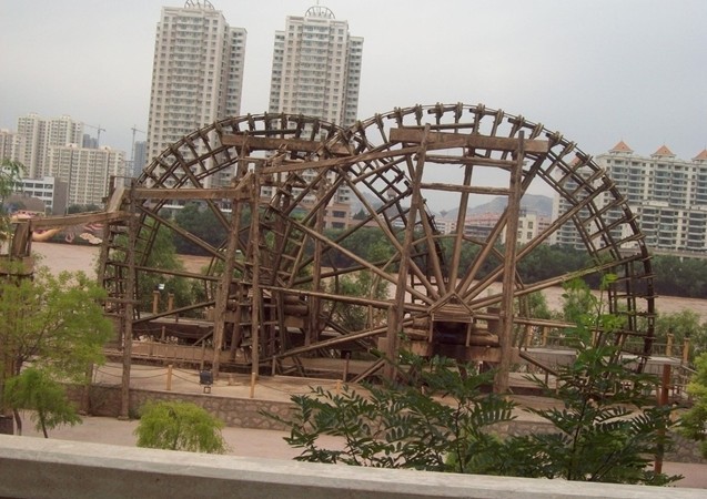 黃河水車又名“天車”、“翻車”、“老虎車”,對(duì)于它的由來,還要從明嘉靖年間說起。明嘉靖二年(公元1523年)蘭州段字灘人段續(xù)考中進(jìn)士后,在云南任道御史時(shí),曾宦游南方數(shù)省,多有惠政。一次在鄉(xiāng)間,他發(fā)現(xiàn)木制龍骨筒車可汲水灌溉,便觀察其構(gòu)造原理,繪成圖樣帶在身邊。后來榮歸故里,便悉心研究反復(fù)實(shí)踐,終于在1556年研制成功了歷史上第一輪水車,當(dāng)時(shí)就坐落于今蘭州市的廣武門外,起名“水車園”,很快,黃河兩岸的農(nóng)民爭(zhēng)相仿制,風(fēng)行一時(shí),龍灣人民也不甘落后,便仿制了我們現(xiàn)在看到的這兩架水車,雖然是后來重修的,但仍然保留了古水車的諸多特點(diǎn)。