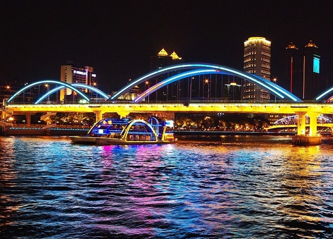 珠江河上11座橋:人民橋、海珠橋、海印橋、洛溪大橋、珠江大橋、廣州大橋,還有新建的解放大橋、江灣橋、華南大橋、鶴洞大橋,和獵德大橋,以及珠江過江隧道,把珠江南北兩岸和芳村區(qū)連成一片;兩岸星級賓館、商廈林立:白天鵝賓館、華廈大酒店、南方大廈、愛群大廈、廣州賓館、廣信江灣大酒直聳云天;夜晚,兩岸燈火璀璨,明月高懸,“珠江夜游”游輪載著滿船游客自西向東,輕泛珠江水,共奏歡樂曲。