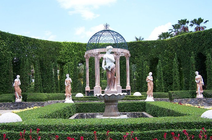 行宮內(nèi)全部采用柚木所建成的,大片綠色草坪上的柚木行宮,建筑風(fēng)格很明顯受到歐洲的影響,但基本是還是根據(jù)泰國的傳說來興建的。它使用了金色的柚木,卻沒有一根釘子在上面。柚木里有特別的油脂,而使得它能抗熱和大雨,再加上這種油脂本身還有驅(qū)去蟲的功能,更使它成為價值不斐的建筑良材。