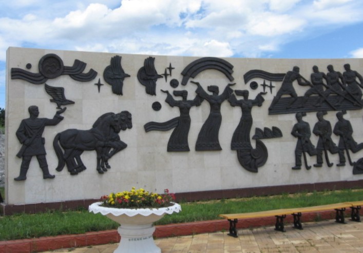 民族園東邊有一個半徑45米的圓形休閑廣場,廣場中央矗立著高大的民族圖騰圓柱,柱身四周塑有達斡爾族曾崇拜的原始圖騰物和人們生產、生活的歷史場景,畫面精美、歷史感強、民族特色鮮明。柱頂有一只雄鷹(海東青)昂首振翅,搏擊長空,意寓勤勞、勇猛、智慧的達斡爾族及莫力達瓦人在向著美好的未來奮力騰飛。環繞圖騰柱的是反映達斡爾歷史上生產生活中使用的大輪車、弓箭、搖籃、神鼓等器物和人們飼養的羊、狗等。廣場上兩面達斡爾族歷史文化墻,藝術地再現了達斡爾族的歷史神話傳說、生產、生活、文體活動等場面。