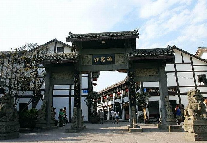 古鎮磁器口有12條街巷,街道兩旁大多是明清風格的建筑,地面由石板鋪成,沿街店鋪林立。商貿集中在大碼頭和靠碼頭的金蓉正街。