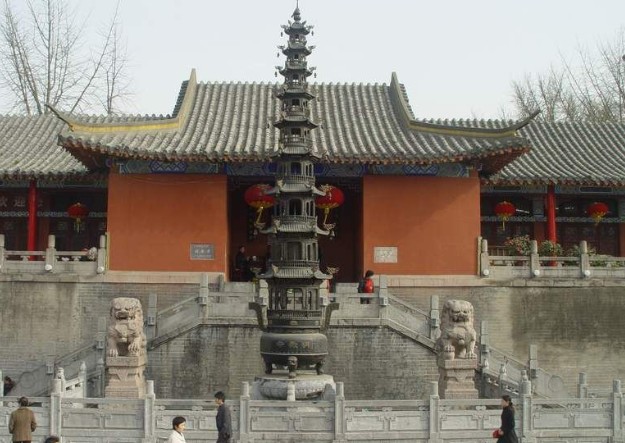 梁武帝時又在臺上建有鐵佛寺。唐大歷年間又重修擴建,定名明教院,至明代改為明教寺。后毀于戰(zhàn)火。明教寺,聳立臺上,雄偉壯觀,乃清光緒十一年太平天國遺老袁宏謨云游募化,按原樣重建而得。明教寺現(xiàn)為全國重點寺廟,由佛殿、藏經(jīng)閣、西廂院三部分組成。殿分正殿和后殿,有佛像三十多尊。大雄寶殿飛檐翹角,風鈴叮鐺,殿脊高聳一巨大錫葫蘆,銀光閃耀,直刺云天,顯示了我國佛教寺院威嚴莊重得建筑特色。寺內(nèi)鐘鼓齊鳴,梵音繚繞,充滿了神奇得宗教色彩。