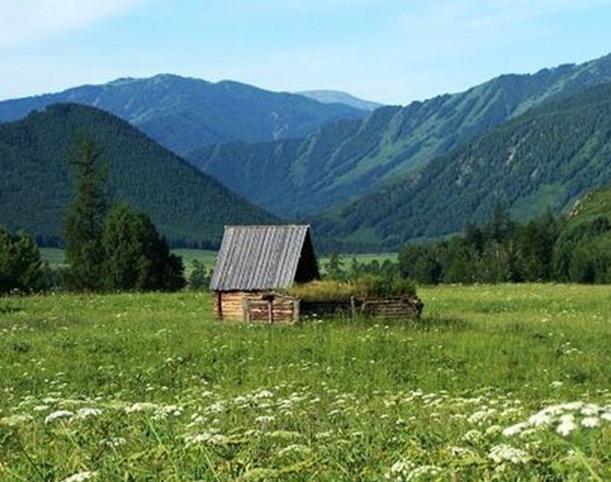 禾木草原位于布爾津縣喀納斯河與禾木河交匯區的山間斷陷盆地中,海拔1124~2300米。盆地周圍山體寬厚,頂部呈渾圓狀,河流多切割為峽谷,地形復雜,禾木河自東北向西南貫穿其間,將草原分割為兩半,山地陽坡森林茂密,蒼翠欲滴,馬鹿、旱獺、雪雞棲息其間;而陰坡綠草滿坡,繁花似錦,芳香四溢,蜜蜂在采花釀蜜,牛羊滿山遍野覓食撒歡,一派迷人的廣袤草原景色。