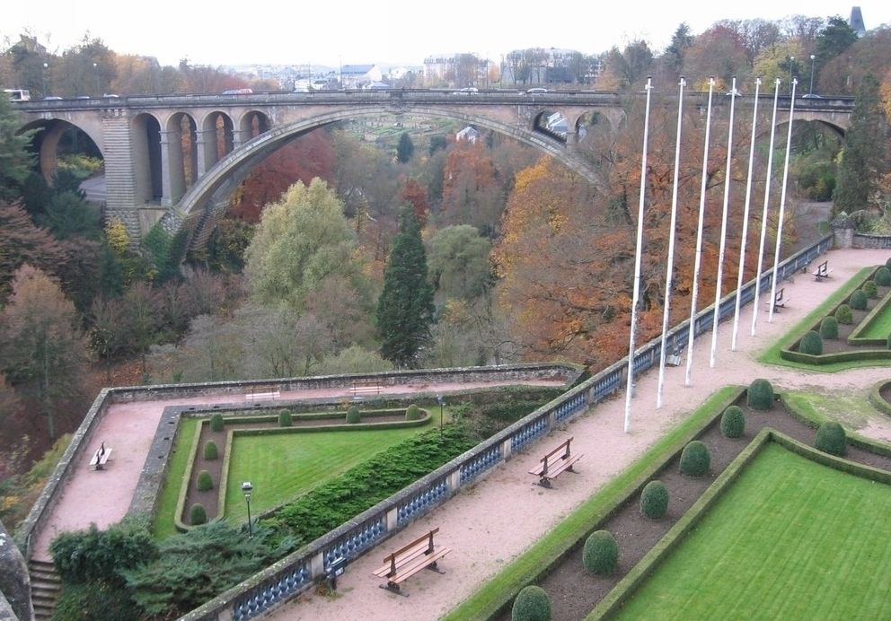 阿道夫大橋 阿道夫大橋作為歐洲地區(qū)杰出建筑物之一,也是盧森堡的市標(biāo)之一的“阿道夫大橋”建于十九世紀(jì)末至二十世紀(jì)初,是一座由石頭砌成橫跨盧森堡大峽谷的高架橋,此橋高46米、長84米,且支撐橋梁的拱門成左右對稱顯得十分壯觀。該橋連接了盧森堡的新、舊兩市區(qū),游客可以從橋上眺望遠處的美麗風(fēng)景。
