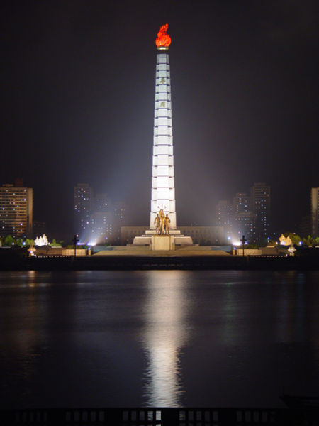 主體思想塔(????? Juche Tower) 位于朝鮮民主主義人民共和國首都平壤市市中心的大同江畔,是為祝賀金日成七十壽辰而建的,塔及其周圍附屬建筑占地總面積15萬平方米。1982年4月15日竣工揭幕。主體思想塔是金日成主席創(chuàng)立的“主體思想”的象征。塔的正面,建有高30米、重33噸的象征工人、農(nóng)民、知識分子的三人群像,左右是以“主體工業(yè)”、“豐年”、“學(xué)習(xí)之國”、“無病長壽”、“主體藝術(shù)”、“銅墻鐵壁”為主題的花崗巖群像。