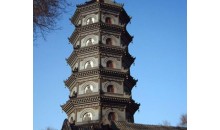 七級浮屠塔 高約37米,布局為國內罕見,正面朝南,緊連磚建硬山式地藏殿。殿前接三間卷棚敞廳,東西兩側各設兩層塔式鐘鼓樓。塔東、南、西三面和北面三層以上開窗,余皆在外設拱形佛龕,塑以生動的羅漢浮雕31尊。殿塔相通,供奉三大佛、四菩薩七尊銅像。 塔內有木梯,可供登臨觀賞。殿和塔檐下的雀替做成龍、鳳、獅、鶴等浮雕,造型生動。塔的局部構件和裝飾具有西方建筑的風格。