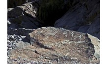 垂吉爾塔格山巖畫,位于托克遜縣城西北55公里處。在十幾、二十公里長的柯爾加依溝的山丘石壁或墜落的土黃色砂巖上,分布著數十幅栩栩如生、形態各異的古代巖畫。巖畫有放牧、狩獵和引水灌溉等圖案,以動物為主,有鹿、駱駝、豹、虎、狼、狗,最多的是大角羊。 畫中人物或行或立,或射箭或騎駱駝,他們頭戴大皮帽,腳穿長腰靴,腰部束帶,雄姿勃發。